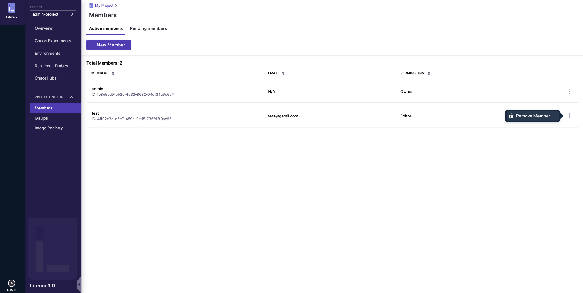 In the Active members tab in the Members page, you will be able to see all the members who have their invitation status as accepted for your project collaboration invite. Here, identify the user to remove and click on the Options icon as shown and select the Remove Member option.
